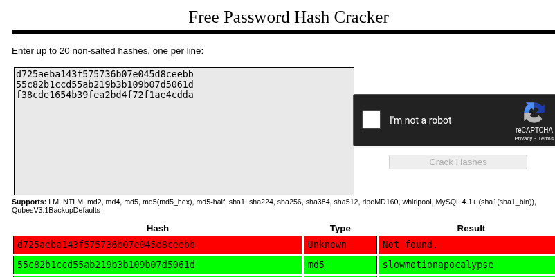 Obteniendo asi los hashes para romper de los usuarios Si leemos el /etc/passwd aprovechando el Command Injection, descubriremos que el usuario tobias existe, por lo que romperemos su password, dando consigo: Por lo que entraremos por SSH.