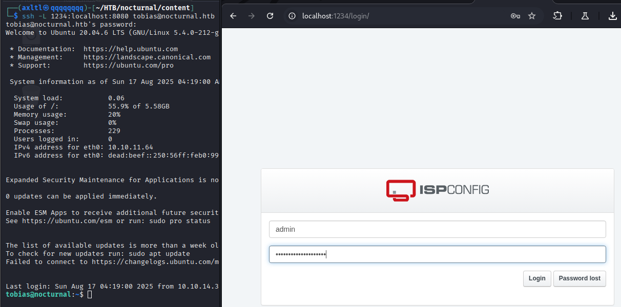 Si entramos como el usuario tobias, podremos ver que no posee permisos de sudoers, ni de SUID o capabilities, por lo que si listamos procesos o servicios que esten prendidos dentro de la maquina, veremos que existe un servicio WEB. Si analizamos de que se trata usando CURL, podremos ver que es una web cuyo titulo es ISPConfig, por lo que nos quedaria traer ese servicio a nuestra maquina por Port Forwarding. Esto lo lograremos con