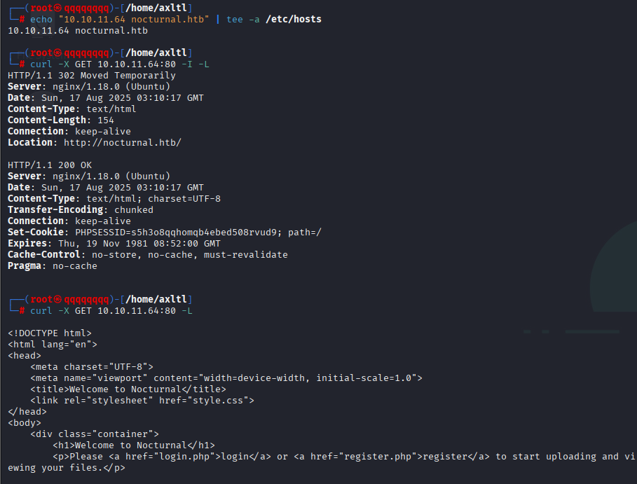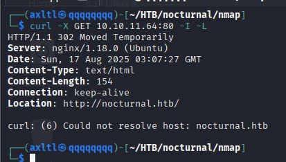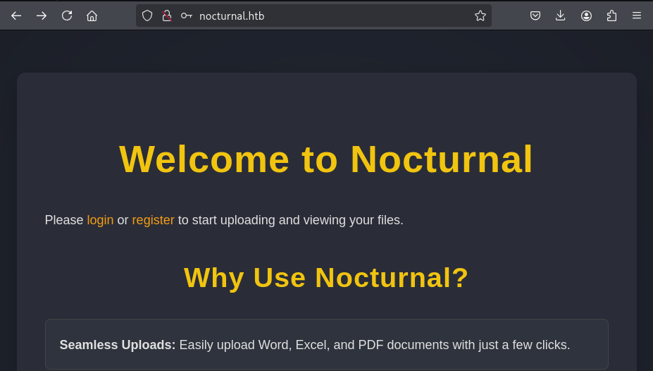 Si vamos a la web, veremos que apunta a un dominio: nocturnal.htb. Pero no puede resolver al host, esto lo podemos resolver haciendo lo siguiente: