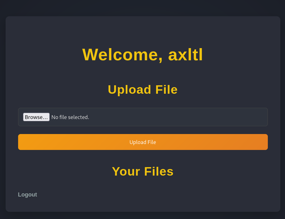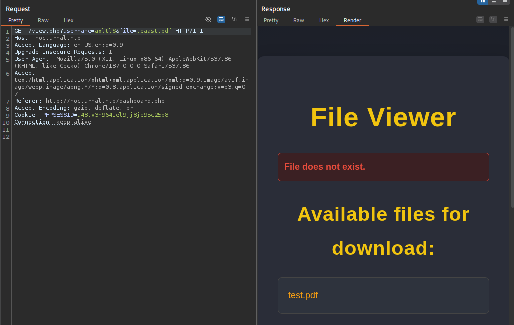 Una vez registrados y logueados veremos lo siguiente: Si subimos un archivo, en este caso test.pdf, podremos ver que podremos descargarlo: Si comenzamos a editar los parametros, veremos algo interesante, si cambiamos el username por cualquier valor Veremos que no nos encuentra el usuario, esto puede darnos indicios de un IDOR. Por las dudas, cambiaremos el valor del parametro file, y veremos que en este caso la alerta nos muestra que no existe el archivo, pero muestra los archivos que existen dentro.