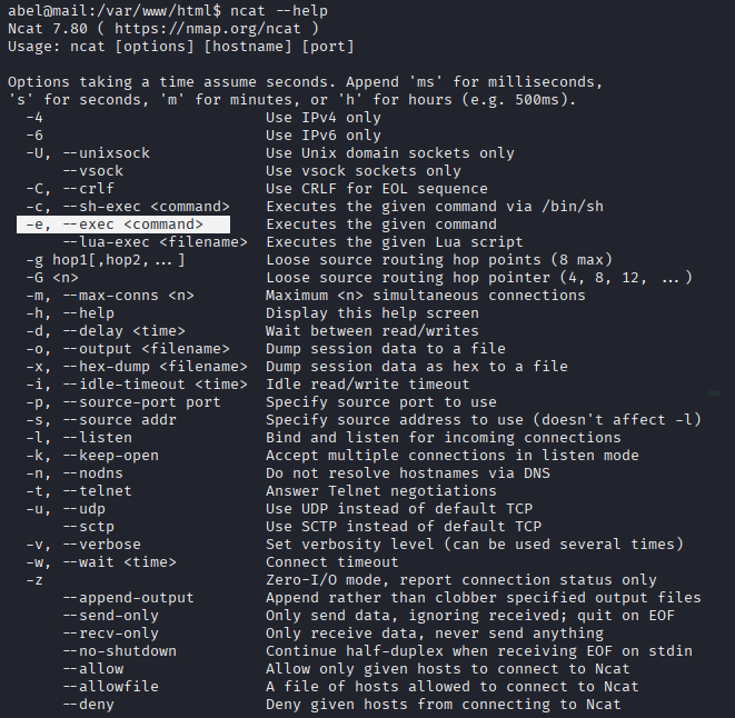 Si vemos la documentacion que tiene NCAT, podemos ver que tambien nos puede ejecutar comandos. Por lo que nos queda seguir la siguiente estructura: