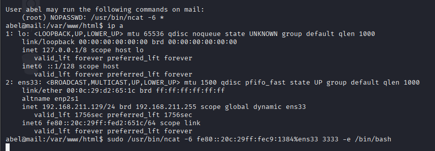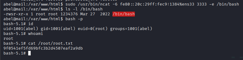 Por lo que podemos tratar de summonearnos una bash. Y como vemos, tenemos el acceso para el usuario abel, este a su vez tiene permisos de ejecutar como usuario root la herramienta /usr/bin/ncat usando IPv6 y cualquier parametro adicional.