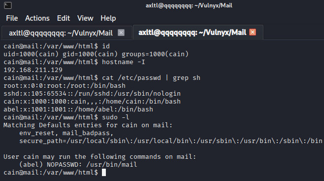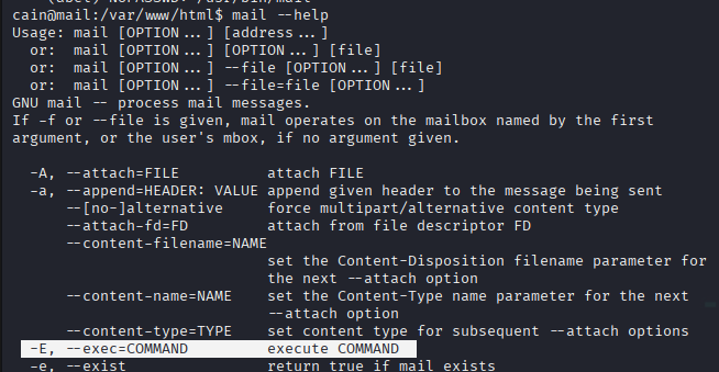 Por lo que nos queda ganar acceso a la maquina, usaremos URL-ENCODE. Y como podemos ver, ya hemos ganado acceso al usuario cain, por los que nos toca pivotar al usuario abel. Y vemos que podemos ejecutar como el usuario abel, el comando mail, y podremos aprovechar la funcion exec que tiene indicado en su documentacion.